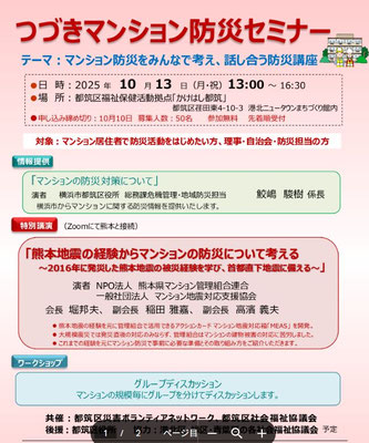 横浜市都筑区災害ボランティアネットワーク、都筑区社会福祉協議会が主催で横浜市内のマンションの住民を対象としたセミナーで参加者約40名。以下のプログラムで開催され、熊管連からはwebで 熊本地震の経験を元に管理組合で活用できるアクションカード マンション地震対応箱「MEAS」 を開発、大規模震災では発災直後の対応のみならず、管理組合はマンションの建物被害の対応に苦労ししたことを発表した。